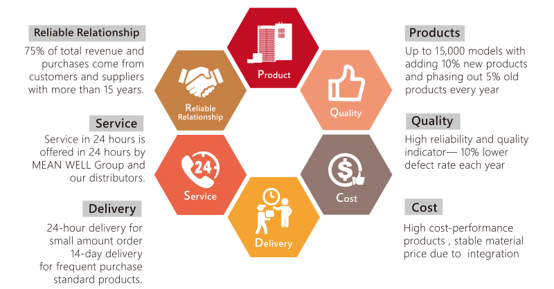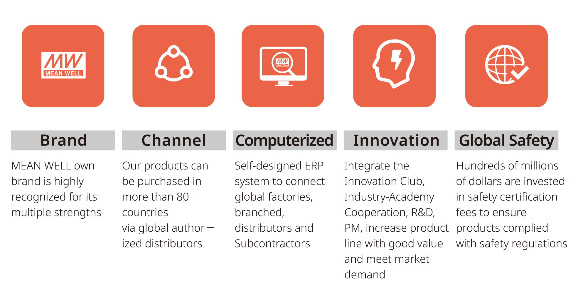 MEAN WELL's niche market is small or medium volume customers for industrial standard power supply products, "more variety at less volume." As such, MEAN WELL is required to meet different power supply requirements of scores of industries with comprehensive product lines, production flexibility, planned stock, and global channels. MEAN WELL's 10,000 plus standard models launched as of 2018, serves a wide range of industries including LED signage/lighting, industry automation/control, information/telecom/commercial, medical, transport, and green energy. With international safety regulation compliance and full-spectrum one-stop-shopping power supply solutions, MEAN WELL is helping customers cut new product development verification time and costs by entering target markets early.