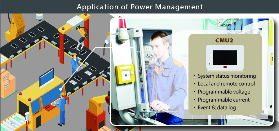 CMU2 also equip with touch panel and PMBus, CANbus, Modbus TCP communication protocols to enhance local or wireless operation.