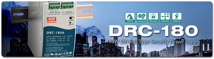 MEAN WELL DIN rail type security power supply DRC-40/60/100 series have been widely used in safety control, fire protection, information communication, automatic control, and other fields for many years. In order to fulfill higher wattage requirements, we are releasing the new 180W DRC-180 series. This product is suitable for installation in the TS-35/7.5 or TS-35/15 rails inside the power distribution box. Not only is the 90~264VAC voltage input applicable to all parts of the world, but also two models of 13.8VDC and 27.6VDC are planned for more customer selections. The DC output side is divided into the main output (CH1), which can be used for the load equipment and the auxiliary output (CH2), which can charge the battery at the same time. In addition, it also has AC OK, battery low voltage alarm, and can form a DC-UPS backup system with an external battery. It is especially suitable for systems that still need to operate normally when AC power failure is considered, such as security control systems, fire protection facilities, emergency lighting systems, alarm systems, database center uninterruptible power systems, central monitoring systems and access control systems...etc.