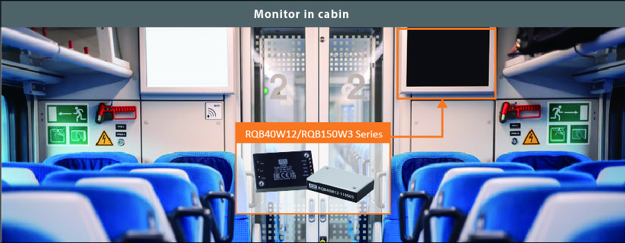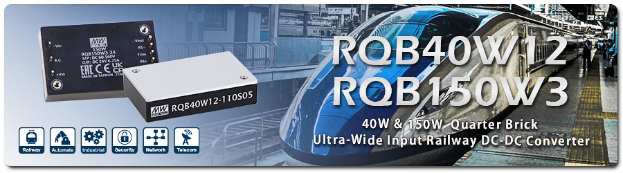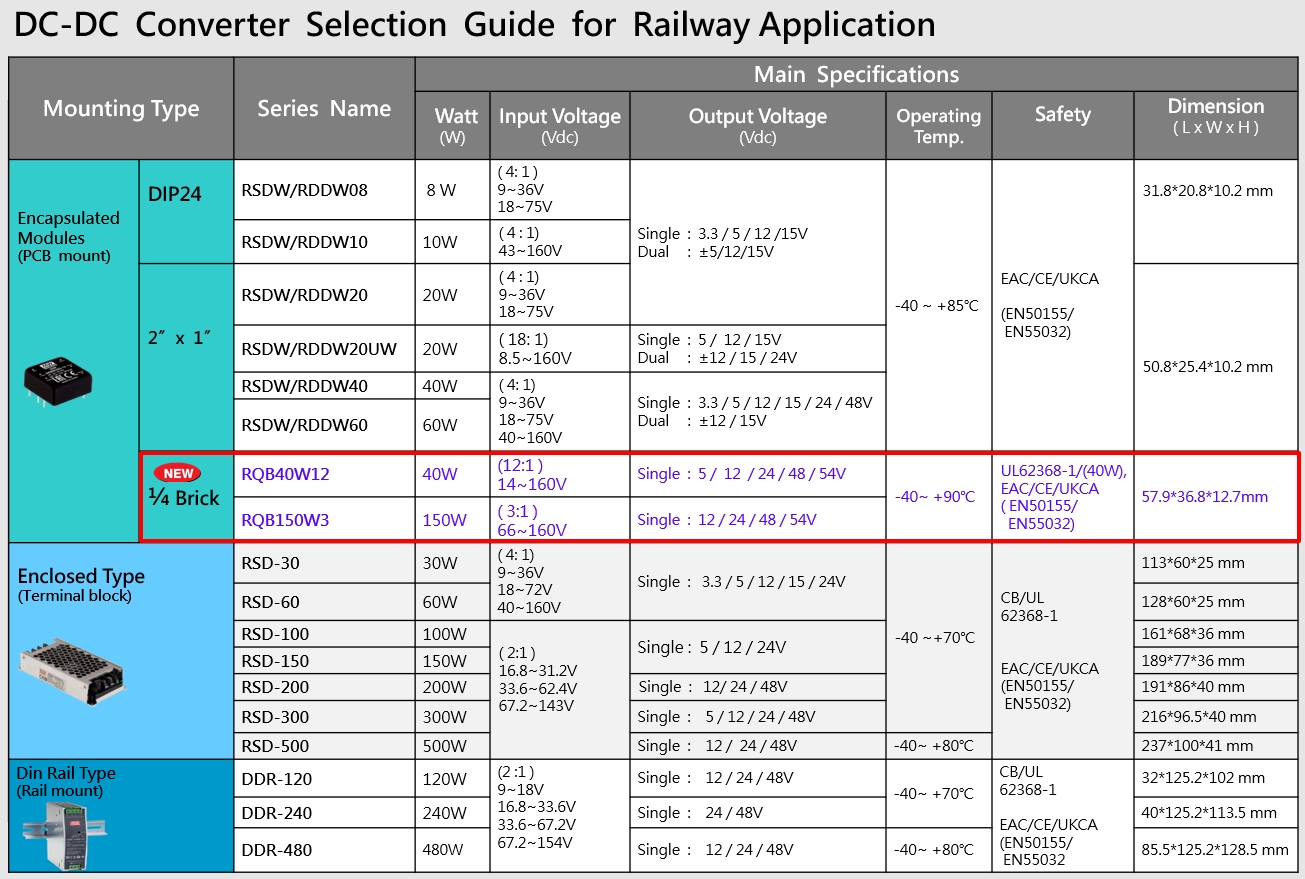 MEAN WELL has subsequently launched various encapsulated module type, enclosed type, and DIN rail type products for railway applications, including 8~480W products in the RSDW/RDDW/RSD/DDR product series (details refer to table below). MEAN WELL is now launching the new ¼ brick type 40W RQB40W12 (12 : 1 14~160Vdc input) and 150W RQB150W3 ( 3 : 1 66~160Vdc input) product series to cover more application power requirements.