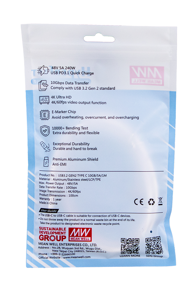 The Type C to C cable, USB 3.2 GEN2, not only meets the maximum charging power of 48V/5A, but also has a large data transmission of 10Gbps. In addition, it is suitable for audio and video transmission by various by electronic devices, such as computers, tablets, portable hard drives, virtual VR glasses and others. The Type C cable with hyper-fast charging and large data transmission capabilities will be your best choice for work or entertainment.