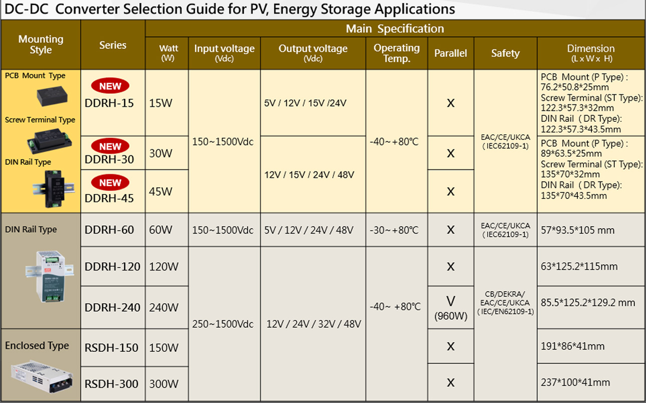 The key features of DDRH-15/30/45 series include: Multi-installation selectable (PCB Mounting Type, Screw Terminal Type, DIN Rail Type), 150~1500 Vdc ultra-wide voltage input, -40~+80℃ wide temperature operation, 4K Vac high isolation input/output protection, suitable for high altitude up to 5,000 meters, passed IEC62109-1 photovoltaic certification; it can be widely used in photovoltaics, energy storage, charging piles or any HV-LV conversion related equipment and systems.