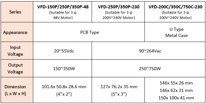 As the SDG Group and global standard-bearer in the power industry, MEAN WELL has launched a new product line: "VFD Series, the Industrial Brushless DC Motor Variable Frequency Drive" after conducting three years of market and industry research along with technological innovation trends. This series includes eight models, covering both DC and AC input voltages, as well as two types of PCB board and enclosed semi-glue machine shell formats. The units come with built-in PFC (only for AC input models) ranging from 150 to 750W, along with standard control and sensor signals, enabling motor speed and braking settings and programming with an external control card. (Card can be purchased separately; please refer to the "Product Roadmap" for more details)