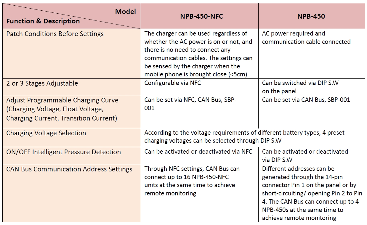 - Built-in NFC communication interface can quickly adjust 2-stage/3-stage and charging parameters (as shown in the table above)