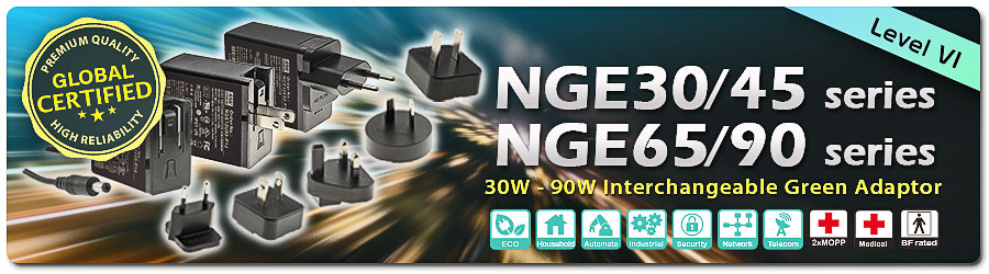NGE 30/45/65/90 Series: 30W~90W Global Certified AC Interchangeable Wall Mount Adaptor