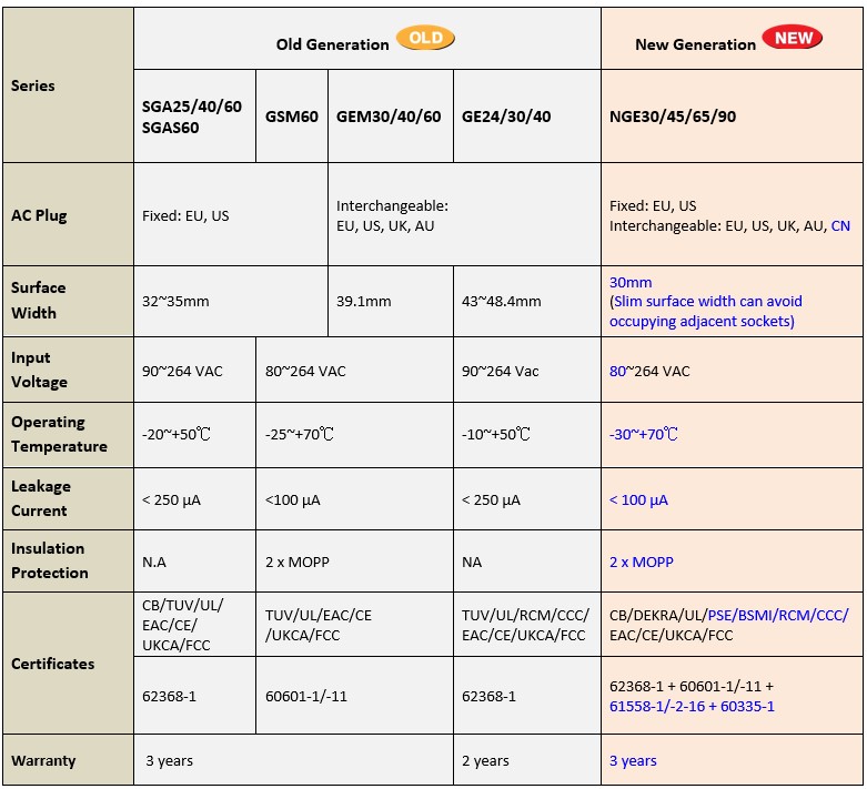 Compared to the series of 24~60W SGA / SGAS / GSM / GE / GEM series that has been on the market for years, the NGE 30 / 45 / 65 / 90 has a significant distinction. The main difference lies in its simultaneous compliance with various safety standards such as 62368-1 / 60601-1 / 61558-1 / 60335-1, as well as additional certifications of CCC / BSMI / PSE. With the slim (30mm) profile design, it prevents occupying adjacent outlets, and its wide temperature range of -30 to +70°C makes it suitable for use in various countries or installations with less spatial constraints. The overall design complies with 2xMOPP and is applicable to medical BF class...etc. (details are listed in the table below). This product is a high-quality, long-life, portable and fully certified wall-mounted green adaptor, ideal for a variety of consumer electronics, travel devices, or any electronic products that require international compatibility with interchangeable AC plugs.