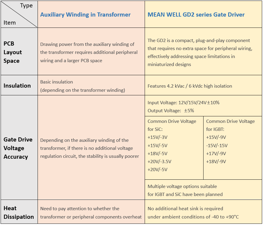 The GD2 series features a modular design with a compact size, offering high isolation of 4.2KVac / 6KVdc and a variety of driver voltage models to choose from. Unlike traditional designs that draw auxiliary power from internal system transformers, the GD2 series offers several key advantages, such as simplifying the peripheral drive circuits on the PCB, improving voltage accuracy, eliminating the need for additional heat sinks, and enhancing isolation performance. The primary differences between these two driving approaches are detailed in the following table: