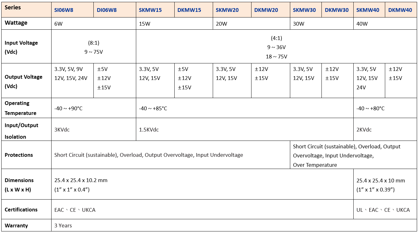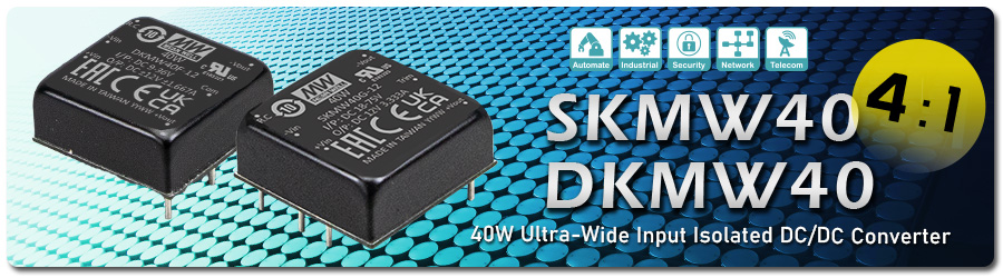 MEAN WELL has received positive feedback on the 1" x 1" 6W/15W/20W/30W wide input range DC/DC converter since its release. In order to fulfill the higher wattage requirements, we're officially releasing the 40W single output SKMW40 and dual output DKMW40 series.