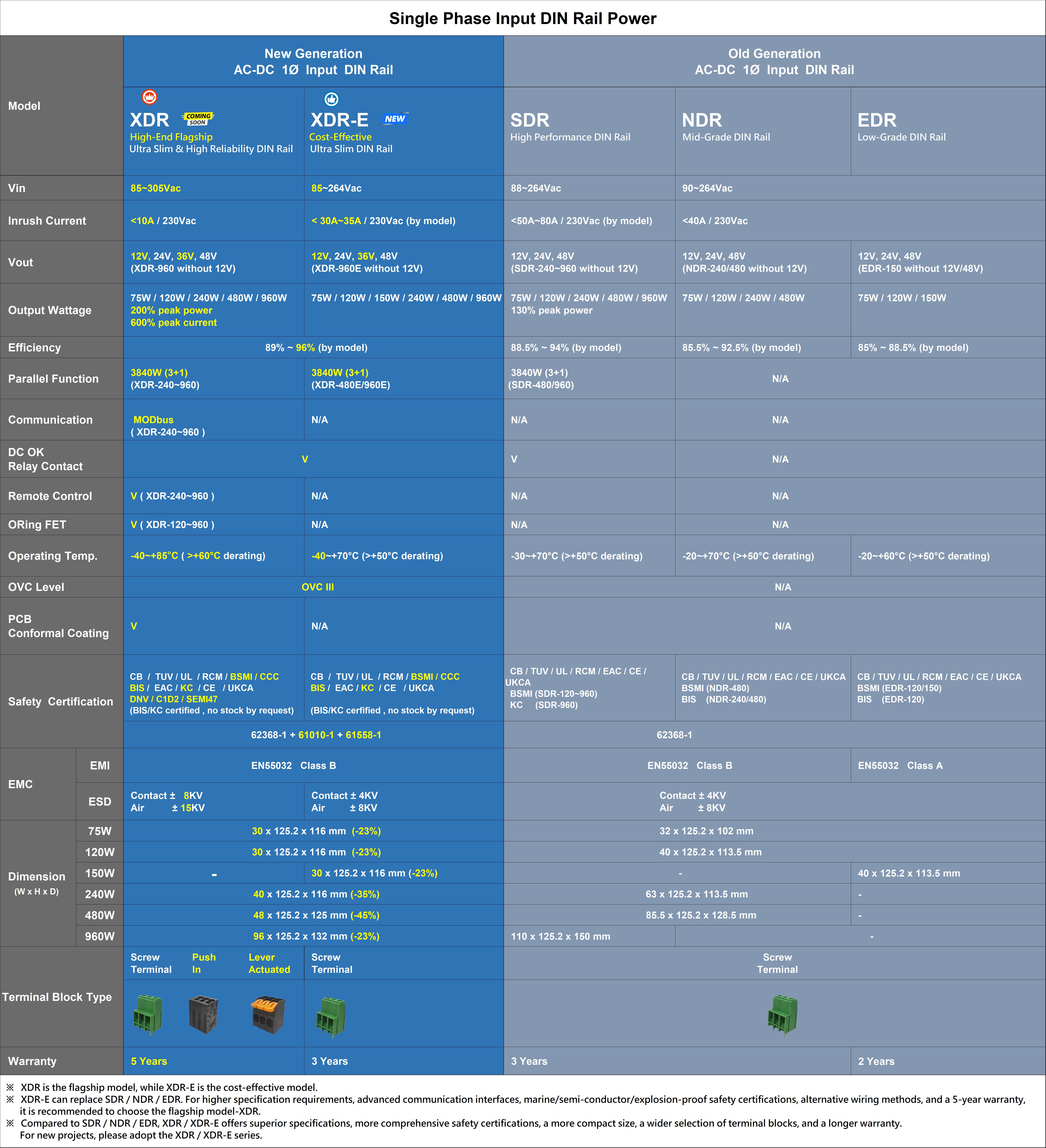 The MEAN WELL SDR/NDR/EDR series (75W~960W) has been on the market for over a decade, earning widespread recognition with cumulative sales reaching nearly 100 million units. These power supplies are widely used in industrial automation, power facilities, renewable energy equipment, network switches, and semiconductor processing equipment, among others. To offer an even greater value option, we are excited to introduce the all-new XDR-E Series (75W/120W/150W/240W/480W/960W).