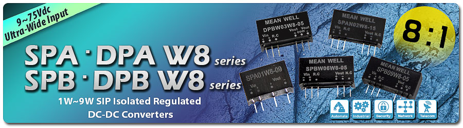 Now, a new generation of ultra-wide input voltage modules has been launched, including the single output SPA01W8 / SPA02W8 / SPBW03W8 / SPBW06W8/SPB09W8 and dual output DPA01W8 / DPAN02W8 / DPBW03W8 / DPBW06W8 / DPB09W8 series. These five new product lines stand out with their ultra-wide 8:1 input voltage range (9~75Vdc), which not only meets broader voltage requirements but also simplifies model selection by standardizing all models to a 9~75Vdc input range, making the selection process significantly easier. The new 5-series modules are pin-to-pin compatible with the previous generation, enabling painless drop-in replacement for end-system designers.