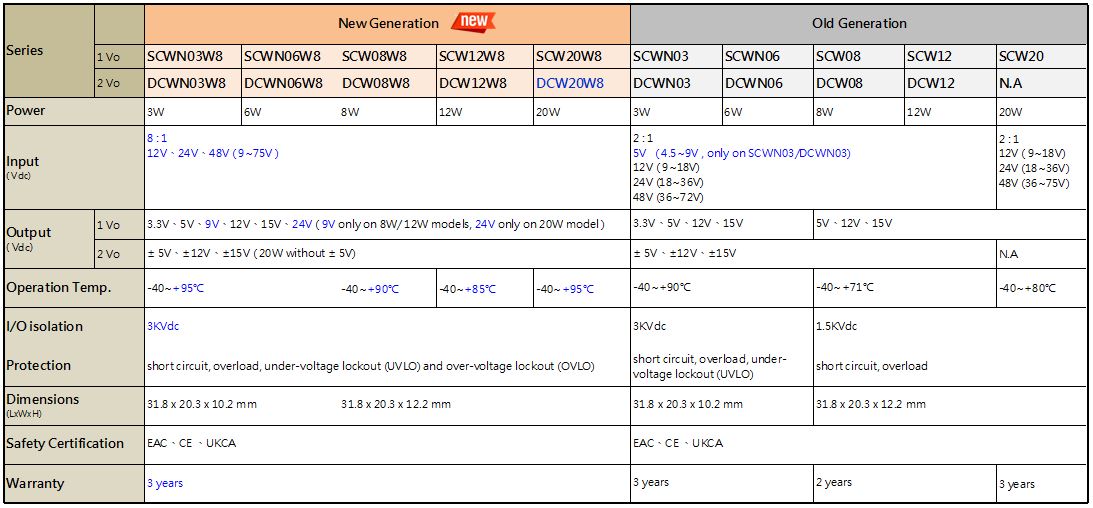 MEAN WELL's 3-20W single output DC-DC converter modules — SCWN03 / SCWN06 / SCW08 / SCW12 / SCW20, and dual output models — DCWN03 / DCWN06 / DCW08 / DCW12 — have been successfully deployed for many years. With annual sales in hundreds of thousands of units, they are widely used in power systems, instrumentation, telecom equipment, industrial automation, IoT applications and other fields.