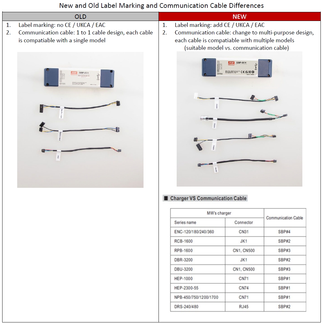 MEAN WELL's intelligent programmer SBP-001 is compatible with increasing number of power products. In order to avoid adding more cables for each new model, we are consolidating the communication cables to be compatible with multiple models. Additionally, the EMC report has been updated and the CE /UKCA/EAC mark will be added to the SBP-001 product label. Please refer to table below for details on the changes. New productions starting August 2022 will include these changes, but there will be a transition period during which both new and old versions will be in stock. The product price will also remain unchanged. If you have any questions about this product change notice, please refer to the latest product specification on the MEAN WELL website, or you may reach out to your MEAN WELL sales representative.