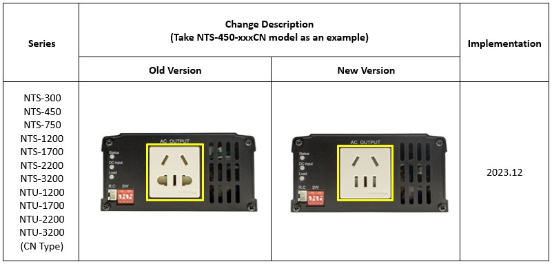 The Chinese plug-in models of the MEAN WELL inverter NTS/NTU series need to be modified according to the new national standard; the modification will not affect the original characteristics of the inverter. Shipments with the new version will be introduced starting from December 2023, and there will be a transitional period for shipping between the old and new versions while the selling price remains the same. If you have any questions about this product change, please contact a MEAN WELL sales representative.