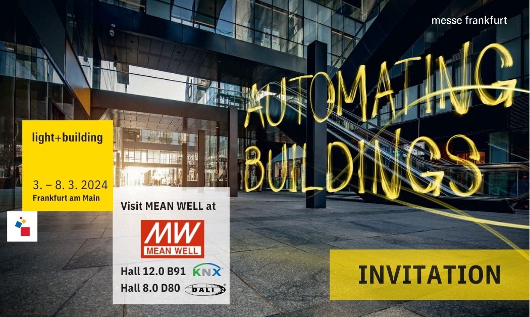 MEAN WELL cordially invites you to visit our booth at Light + Building 2024, the world's leading trade fair for lighting and building service technology, taking place in Frankfurt, Germany, from 3 – 8 March 2024.