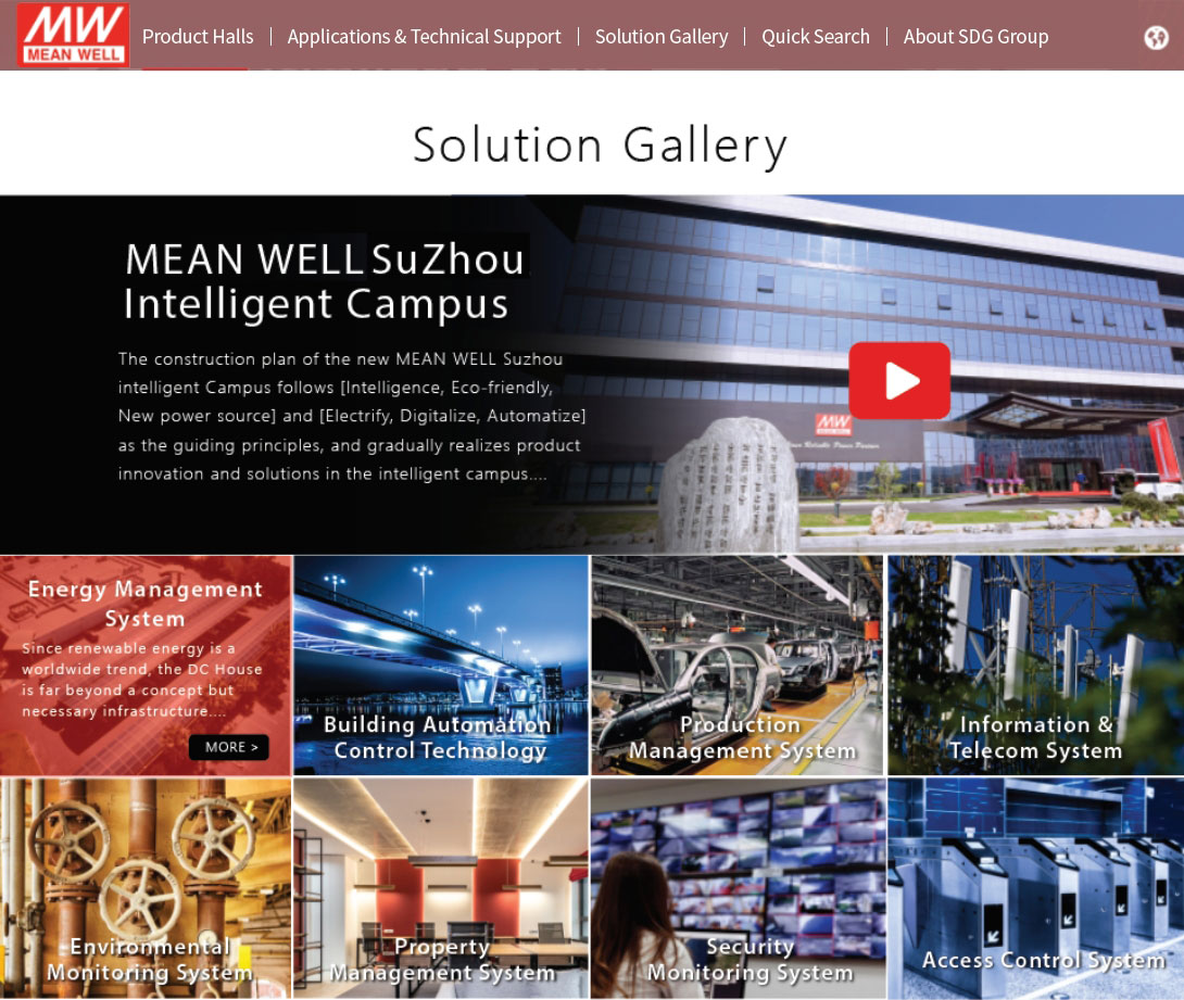 The newly opened MEAN WELL Suzhou Intelligent Campus is an application park where MEAN WELL Group presents product innovations and energy solutions with the guiding principles of "Intelligence, Eco-friendly, New electric power" and " Electrify, Digitalize, Automate". We invite you to visit the 8 major systems in the Intelligent Campus, and you will learn about the relevance and impact of MEAN WELL's standard power supply in various industries, providing a wide range of the most advanced solutions for all of MEAN WELL's industrial customers.