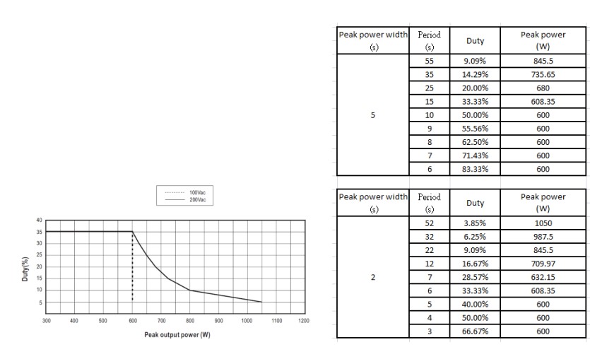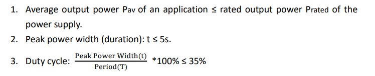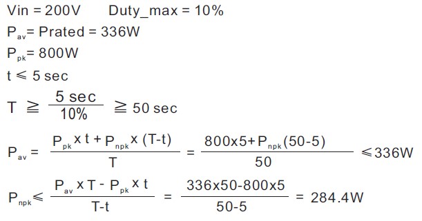 - With the requirements of 800W peak power and t < 5sec, Period: ≧ 45sec, meaning the supply should be cooled down (or at Pnpk mode) for at least 45 sec before starting another peak power output.
