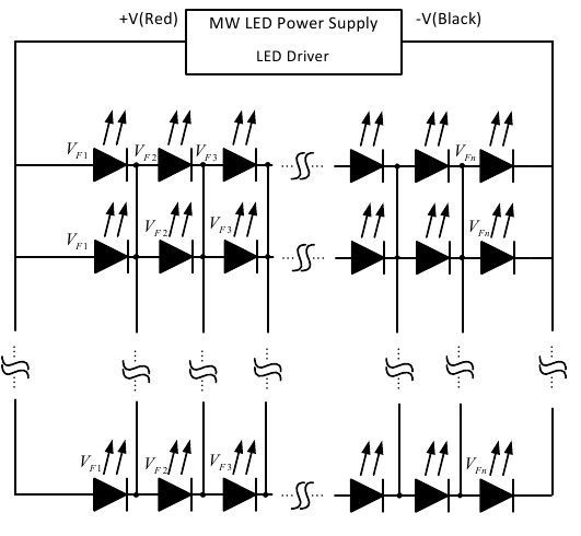 Previously, when high-power LED luminaries were in the early stages of development, the LED chip manufacturing process and materials can readily affect the LED forward voltage difference. Each loop of the LED light string will be equipped with a linear constant current source, as indicated in Figure 1, to ensure the current range of each channel for prolonged LED luminary life. In most cases, a constant current source is provided using a linear IC or a DC-DC LED driver. Generally, the constant current source uses a constant current IC or with a DC-DC LED driver. However, with the optimization of the LED process, the reduction of the LED forward voltage difference and the demand for high-efficiency lamps, high-power lamps are mostly “directly driven” as shown in Figure 2. Mobile illumination, solar streetlights, centralized power supply, and other applications are becoming more prevalent for DC-DC LED drivers.