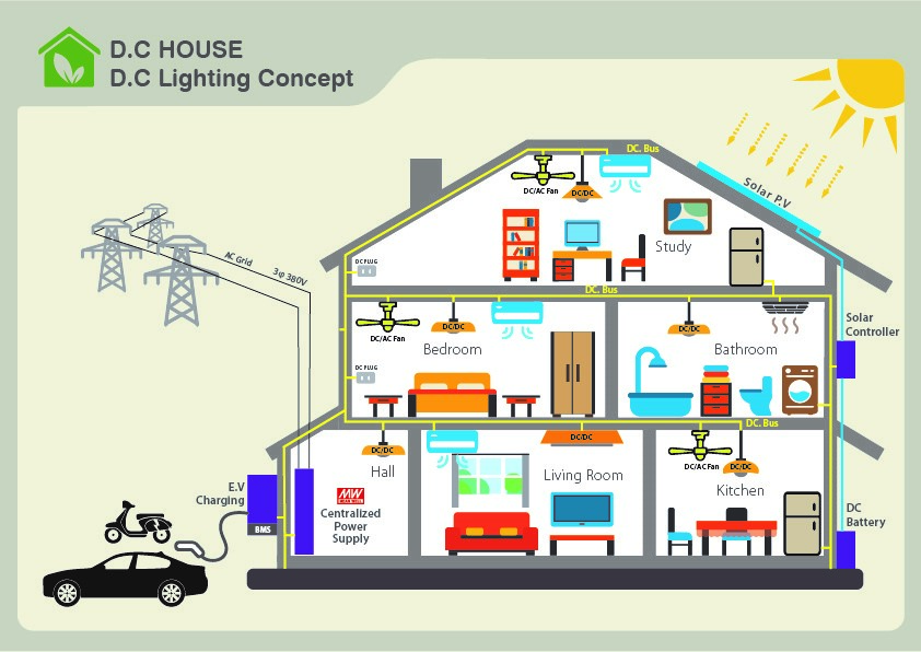 As environmental awareness and demand for energy savings and carbon reduction develop, electric vehicles and green energy become increasingly widespread. The future power supply trend is expected to be high-voltage DC centralized power distribution. The high-voltage DC power supply busbar is built-in in the room, as illustrated in Figure 3. Models of MEAN WELL power supplies include the UHP-1500-HV and RST-7K5-HV series, as well as the 380VDC, is the output voltage. Besides providing fast charging for electric vehicles and the operation of various devices in the room, it can be used with the step-down DC-DC LED driver, NHDD-40 series, to drive the lighting fixtures in the room.