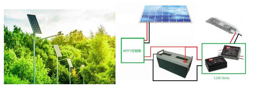 As shown in Figure 4, the solar panel charges the battery through the MPPT controller when there is enough sunlight. A low-voltage battery, such as a 12VDC or 24V DC battery, is usually utilized for safety reasons because it has a more stable charging performance. At night, the boost DC-DC LED driver, LDH-25/45(DA)/65, within the lamp can increase the battery voltage by 12V or 24V to supply power for larger wattage solar LED streetlights or mobile LED lighting fixtures. In addition boosted LED drive power can be applied to automobile or ship batteries as a DC-powered source, as shown in Figure 5.