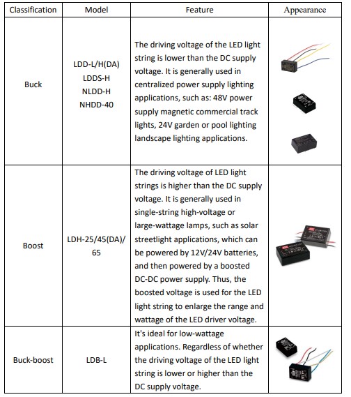 DC-DC LED drivers can be classified into the buck, boost and buck-boost according to the structure used. The table below shows the classification and features of MEAN WELL products