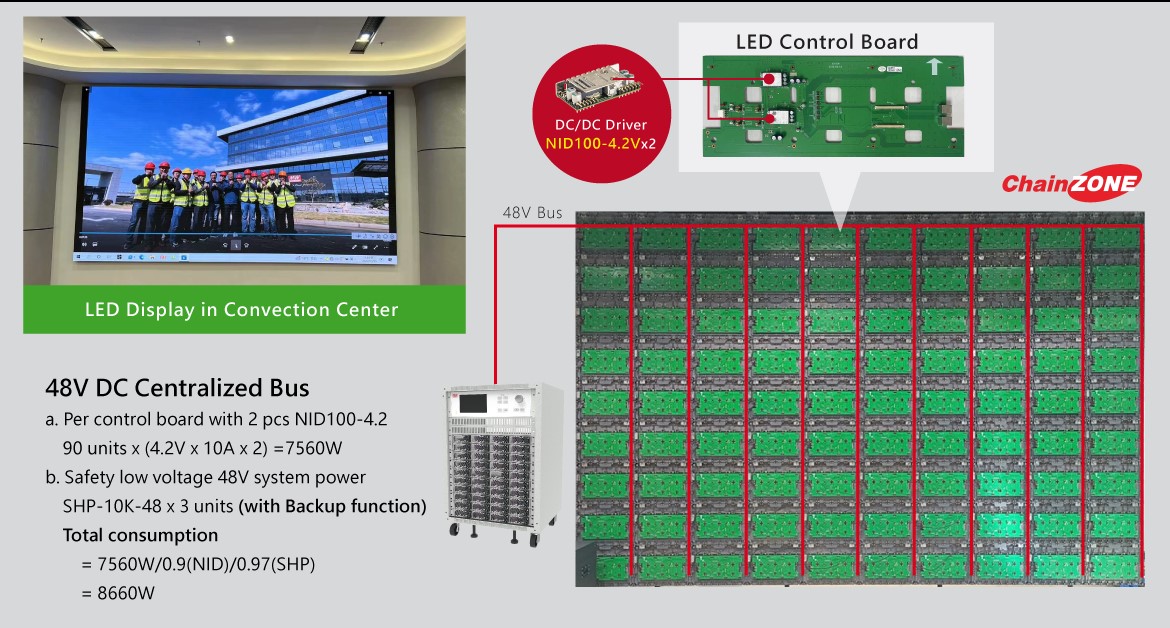 For this DC centralized power solution, MEAN WELL cooperates with PBM customer Foshan Chainzone Technology Co., Ltd. which operate with an indoor small pixel pitch (P1.5) display, each cabinet design with two NID100-4.2V/10A DC-DC module to driver control board and can provide 8K high-definition resolution. It is used at the MEAN WELL Suzhou intelligent park convention center for staff training or distribution conferences.