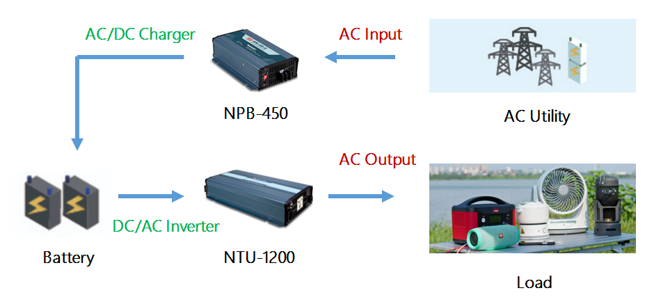 MEAN WELL introduces the NPB series of smart chargers and the NTS/NTU series of high-efficiency inverters, which can be used with user-side battery systems. These products not only address power supply issues in various non-AC power sites but also serve as battery-based UPS backup power supplies, enhancing the stability of overall system operation. The figure below shows a basic configuration of a mobile energy storage application.
