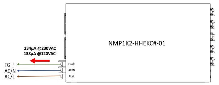 It’s observed that the NMP1K2-HHEKC#-01 earth leakage current is 234μA at 230Vac, which is much less than the 856μA total Erath leakage current of the four MSP power supplies. Therefore, the NMP1K2-HHEKC#-01 leakage current meets the 500μA~750μA leakage current requirement of the Consumer Electrical Equipment.