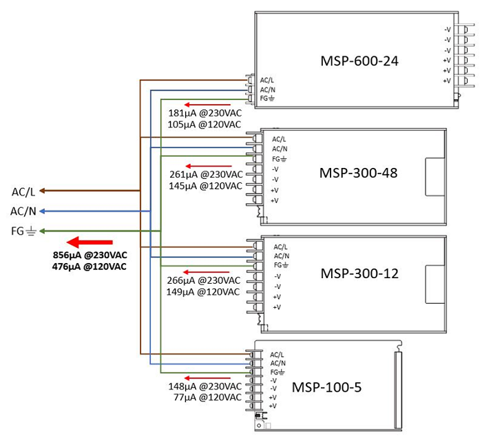 Figures 1 and 2 show the leakage current test results of the MEAN WELL NMP1K2-HHEKC#-01, which consists of four outputs 24V, 12V, 48V, and 5V, and the total leakage current of four power supplies: MSP-600-24, MSP-300-12, MSP-300-48 and MSP-100-5.